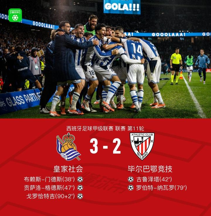 北京时间11月2日西班牙足球甲级联赛 联赛 第11轮,皇家社会主场对阵毕尔巴鄂竞技。皇家社会布赖斯-门德斯破门,贡萨洛-格德斯破门,戈罗恰特吉破门。毕尔巴鄂竞技古鲁泽塔破门,罗伯特-纳瓦罗破门。最终比分皇家社会 3-2 毕尔巴鄂竞技。