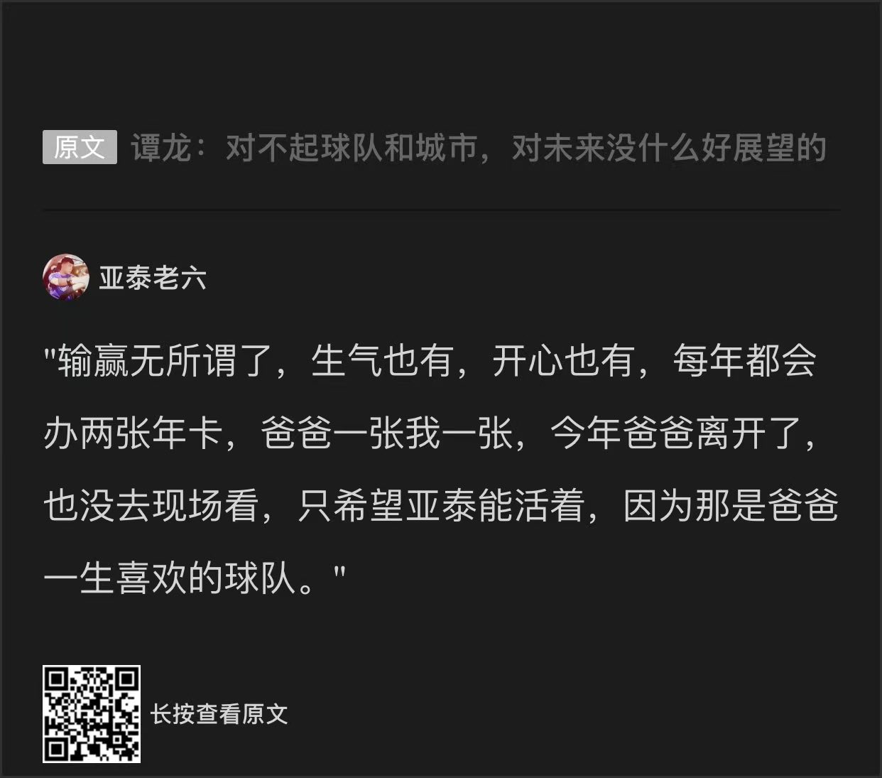 但是我还是那句,只要亚泰不解散,中甲我也一样看!希望亚泰永远活下去吧,别管中超中甲甚至是中乙,活下去就好,等我几十岁的时候领我的孩子或者是孩子的孩子,还能去看亚泰的比赛就行,加油啊亚泰!