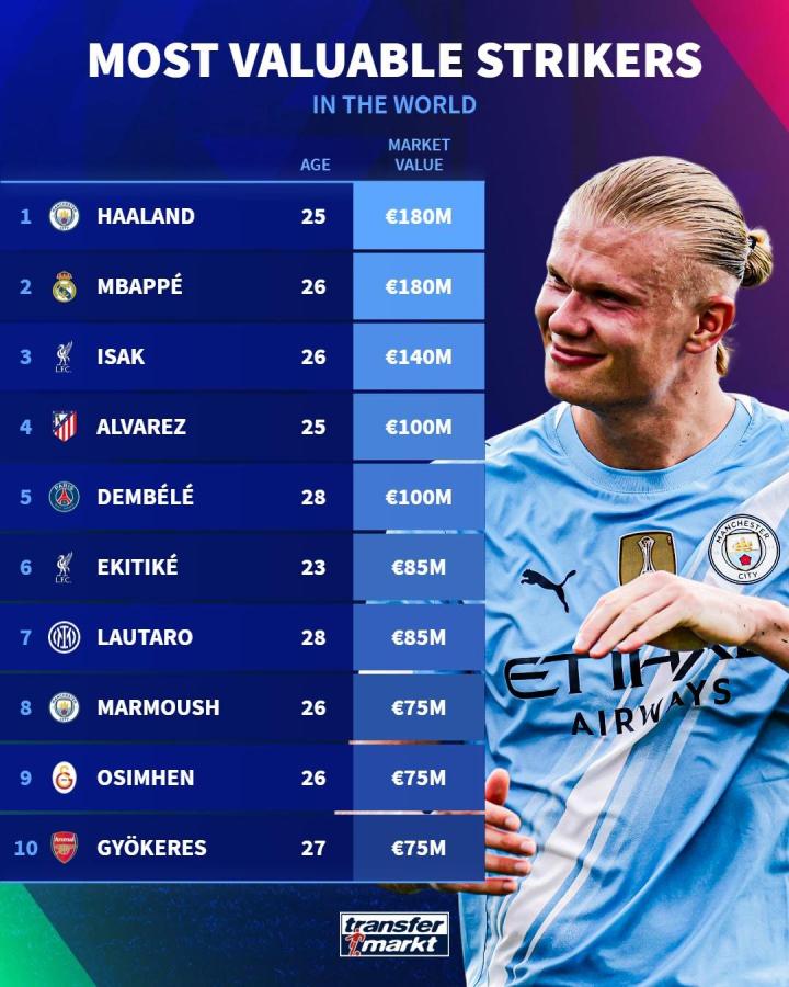 扫描下载懂球帝首页>动态> 德转列中锋身价榜:哈兰德1.8亿欧居首,姆巴佩第二