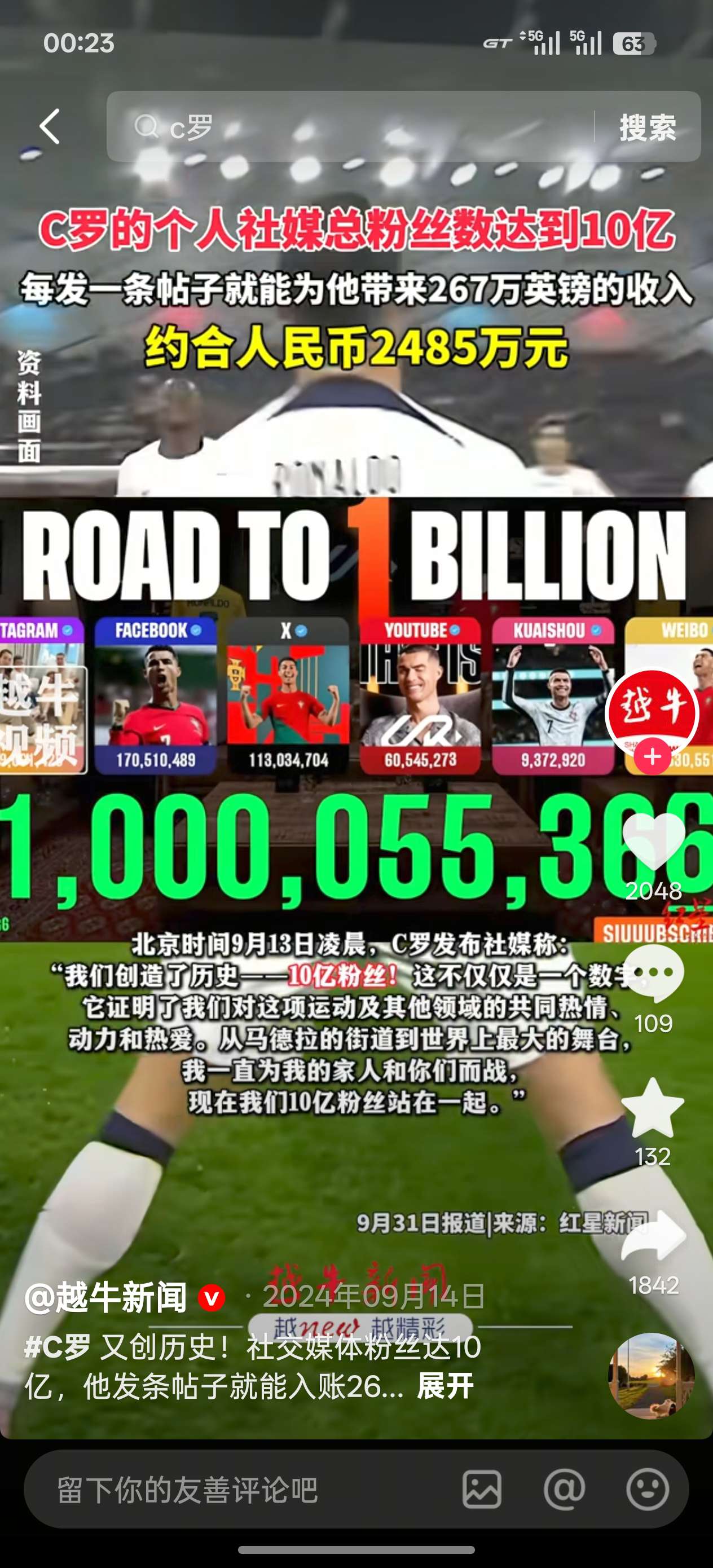 c罗有10亿美元很出奇?都红了这么多年了,你们不知道c罗的社交软件就有超过5亿粉丝吗?光这个社交账号这块都能值个几亿美元了。抖音1亿多粉丝的小杨哥都赚10个亿人民币了吧?c罗可是5亿粉丝