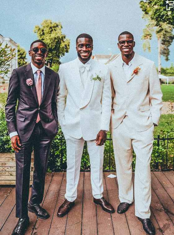 去年七月,奥斯曼-登贝莱身着深色西装,搭配浅粉色领带和太阳镜出席了乌帕梅卡诺的婚礼。当晚在社交媒体上流传的视频显示,这位巴黎欧冠冠军球员嘴里叼着婚礼小礼物,与穆斯塔法-迪亚塔并肩而立。三人留下了下面这张合影——而更早之前,登贝莱的婚礼秘密举行,没有邀请几乎任何一位圈内人员,除了乌帕。
