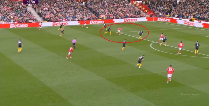 在这之后,才是诺丁汉森林的施压,迫使曼联两个边锋全部深度落位: