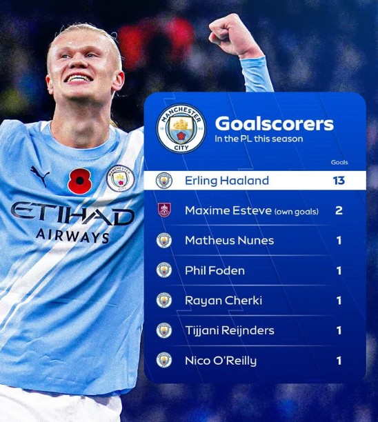 扫描下载懂球帝首页>动态> 曼城队内英超射手榜:哈兰德13球,乌龙2球,其他均为1球