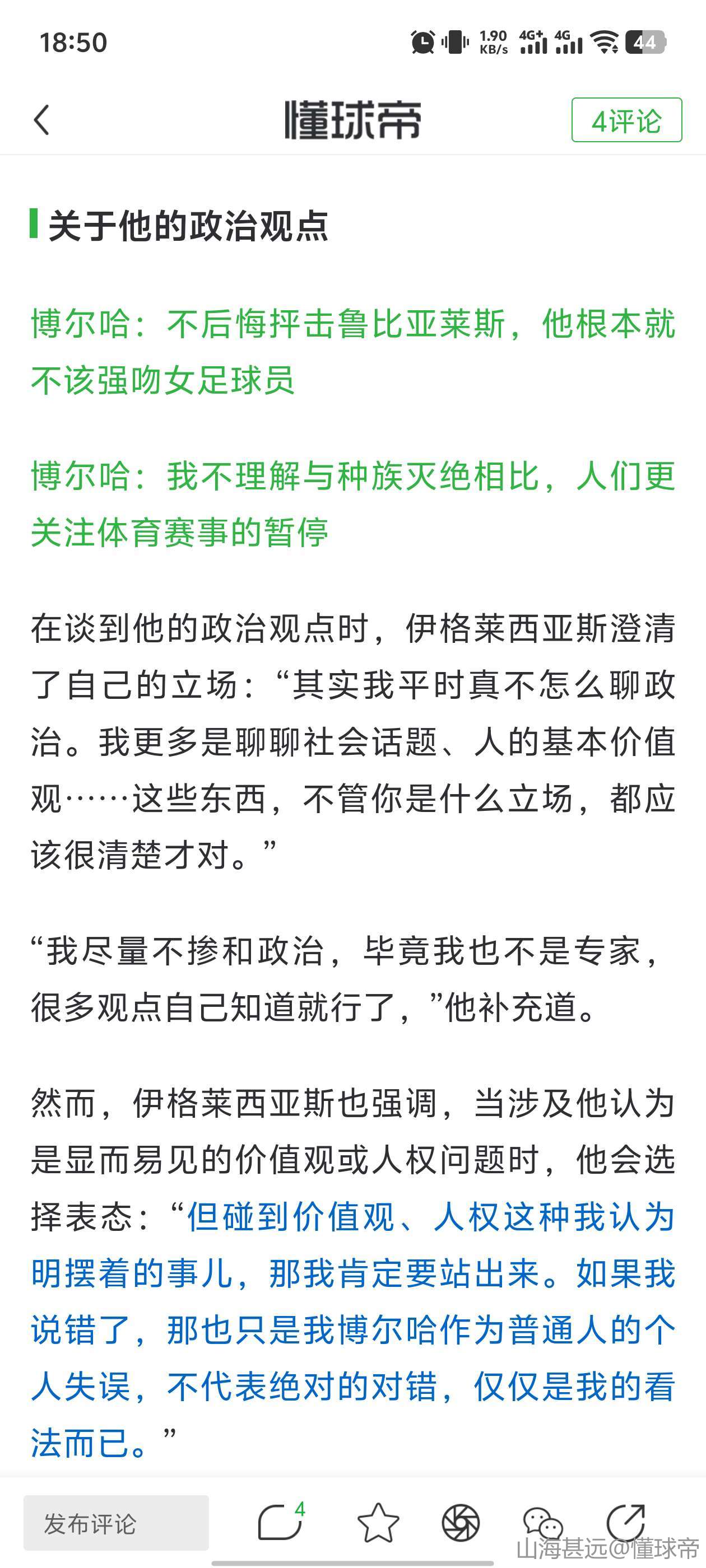 然而,伊格莱西亚斯也强调,当涉及他认为是显而易见的价值观或人权问题时,他会选择表态:“但碰到价值观、人权这种我认为明摆着的事儿,那我肯定要站出来。如果我说错了,那也只是我博尔哈作为普通人的个人失误,不代表绝对的对错,仅仅是我的看法而已。”