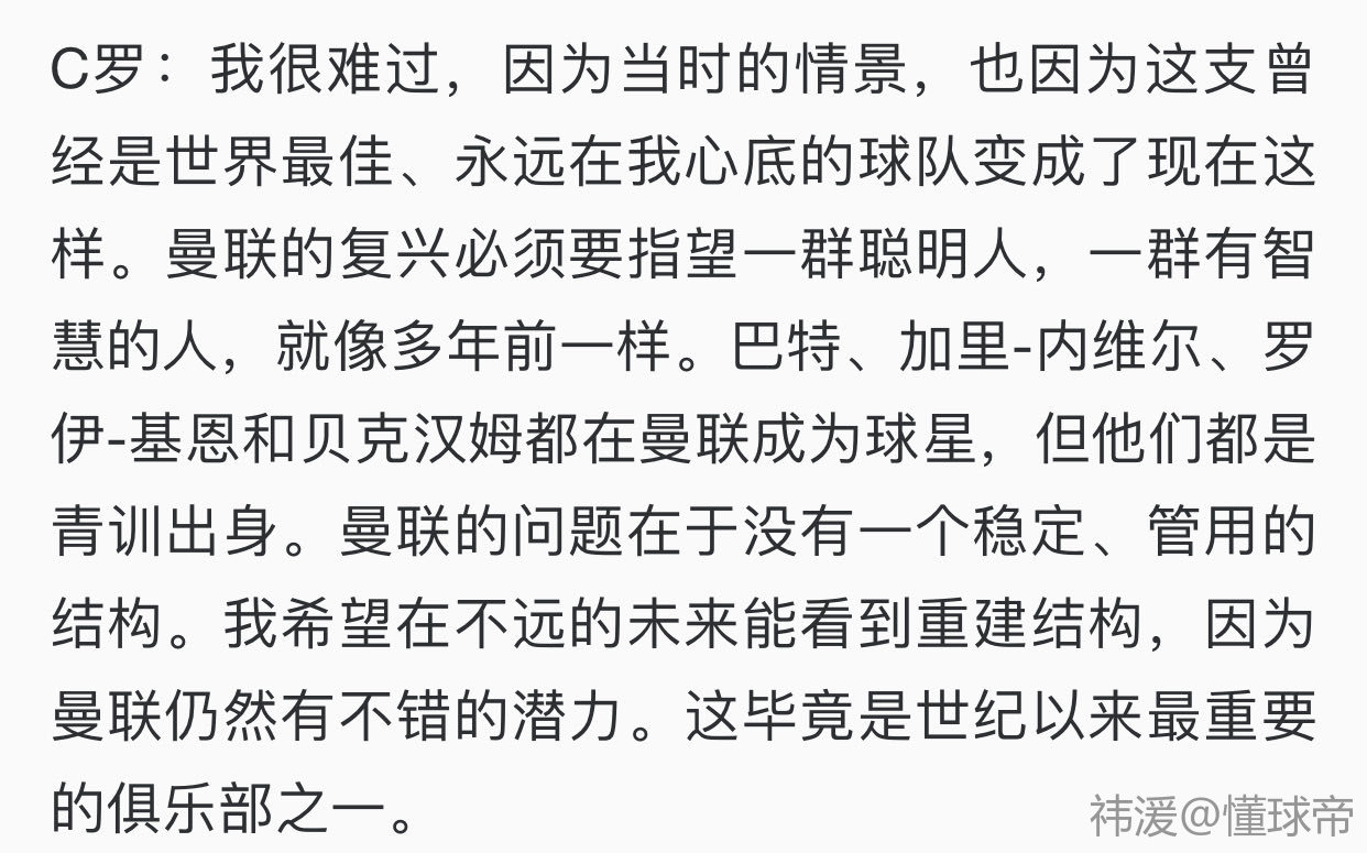C罗:我很难过,因为当时的情景,也因为这支曾经是世界最佳、永远在我心底的球队变成了现在这样。曼联的复兴必须要指望一群聪明人,一群有智慧的人,就像多年前一样。巴特、加里-内维尔、罗伊-基恩和贝克汉姆都在曼联成为球星,但他们都是青训出身。曼联的问题在于没有一个稳定、管用的结构。我希望在不远的未来能看到重建结构,因为曼联仍然有不错的潜力。这毕竟是世纪以来最重要的俱乐部之一。