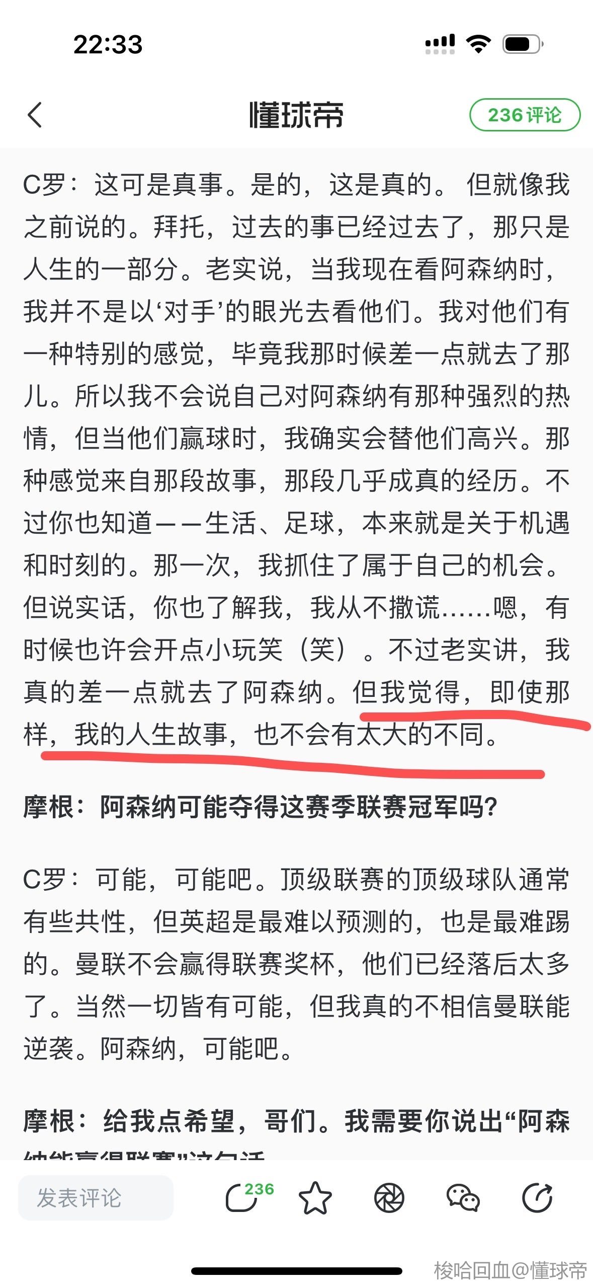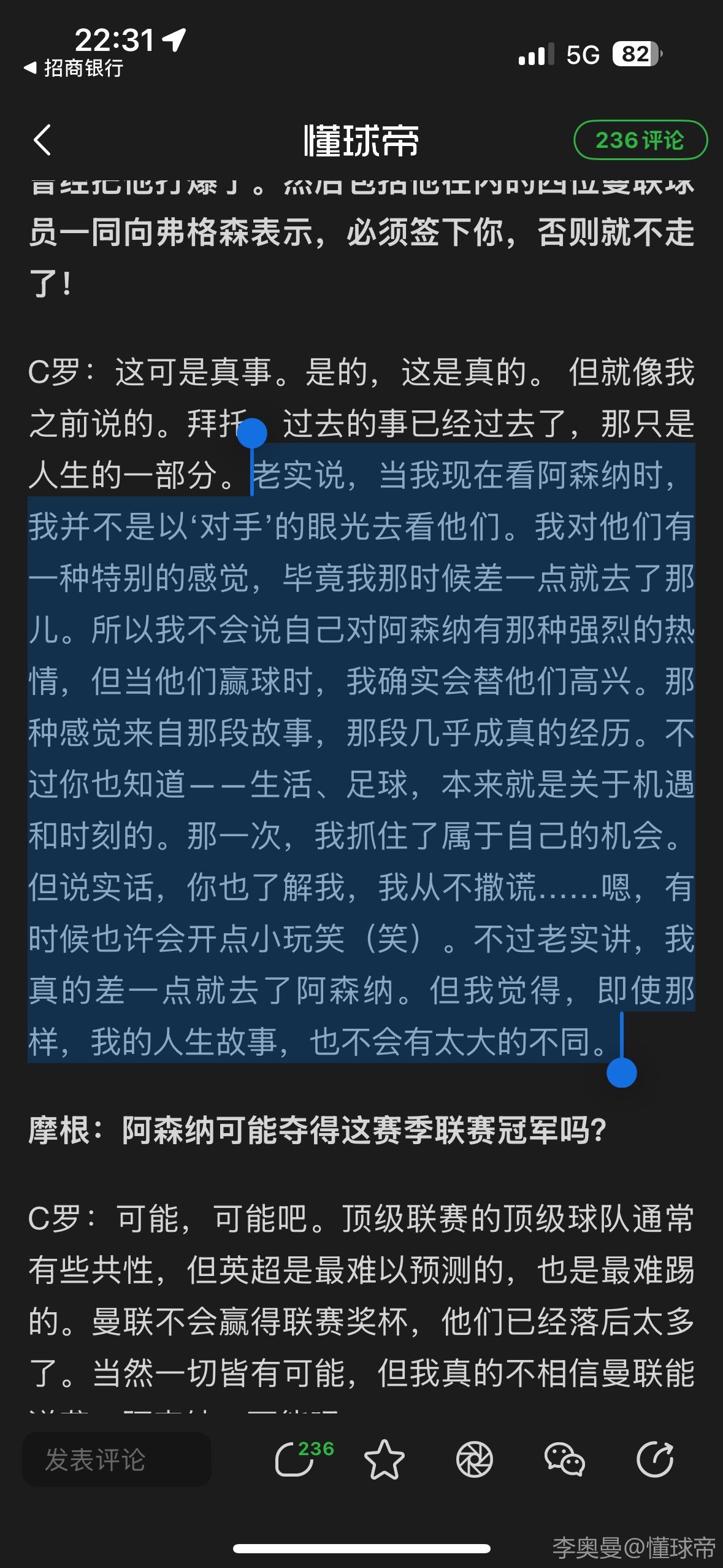 C罗:这可是真事。是的,这是真的。 但就像我之前说的。拜托,过去的事已经过去了,那只是人生的一部分。老实说,当我现在看阿森纳时,我并不是以‘对手’的眼光去看他们。我对他们有一种特别的感觉,毕竟我那时候差一点就去了那儿。所以我不会说自己对阿森纳有那种强烈的热情,但当他们赢球时,我确实会替他们高兴。那种感觉来自那段故事,那段几乎成真的经历。不过你也知道——生活、足球,本来就是关于机遇和时刻的。那一次,我抓住了属于自己的机会。但说实话,你也了解我,我从不撒谎……嗯,有时候也许会开点小玩笑(笑)。不过老实讲,我真的差一点就去了阿森纳。但我觉得,即使那样,我的人生故事,也不会有太大的不同。