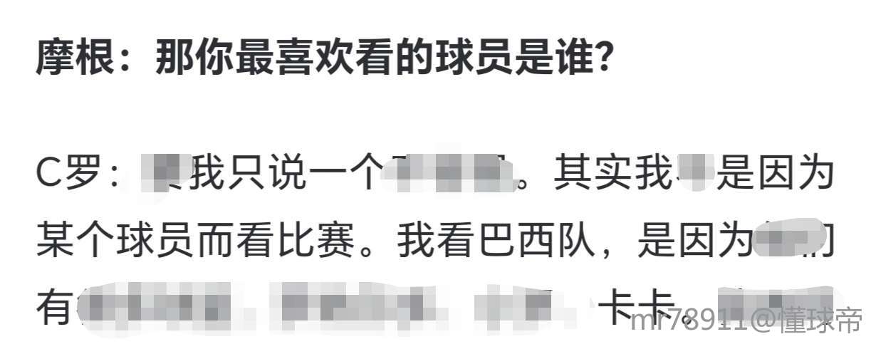 C罗:要我只说一个不容易。其实我不是因为某个球员而看比赛。我看巴西队,是因为他们有很多球星,罗纳尔多、小罗、卡卡。我看阿根廷、看西班牙,也一样。不是因为一个人,而是因为他们的整体。我当然尊重那些伟大的球员,他们让比赛更精彩,但我不会只为了一个人去看球。