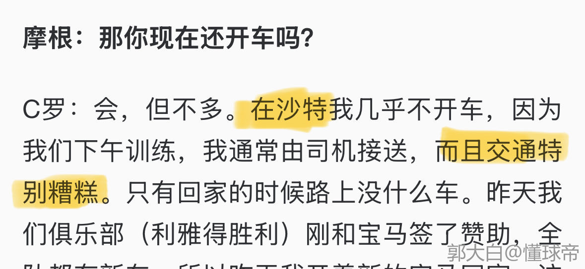 C罗:会,但不多。在沙特我几乎不开车,因为我们下午训练,我通常由司机接送,而且交通特别糟糕。只有回家的时候路上没什么车。昨天我们俱乐部(利雅得胜利)刚和宝马签了赞助,全队都有新车,所以昨天我开着新的宝马回家。这是我在沙特开车的第一次,或者说,六个月内的第一次开车。