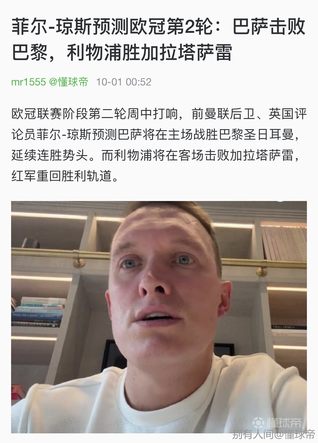 欧冠联赛阶段第4轮周中开打,前曼联后卫、英国评论员菲尔-琼斯预测利物浦将在主场不敌皇家马德里,而曼城战胜多特蒙德。