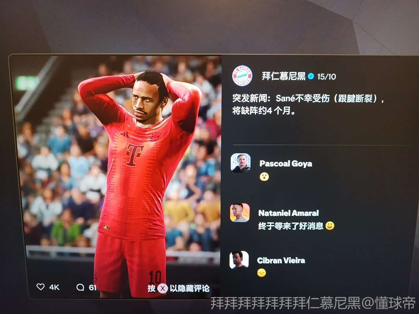 萨内:“我会根据自己的身体状况决定。我没有设定固定年龄。关键是身体状况和竞技水平。如果觉得无法保持最高水平,需要调整,那就调整。但只要我喜欢踢球并且身体允许,我会尽量踢得久。”