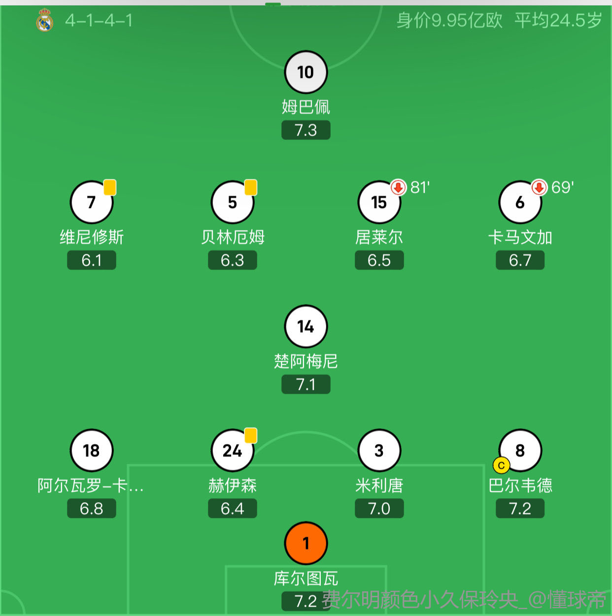 皇马首发身价9.95亿欧这场库尔图瓦独占5亿。