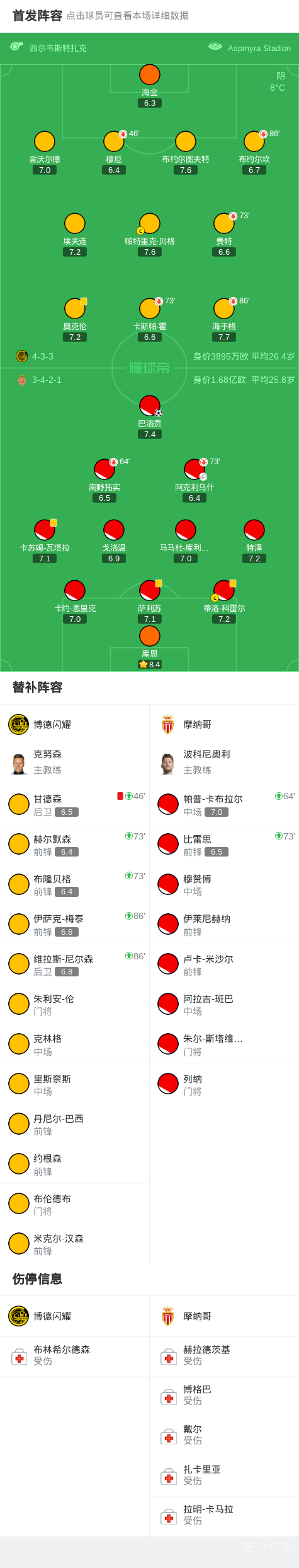 第43分钟,巴洛贡小角度破门,摩纳哥1-0