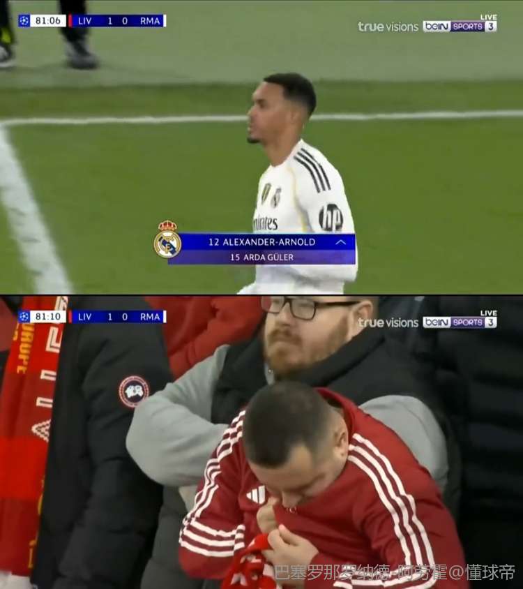 第66分钟,替补观战,镜头再次给到了亚历山大-阿诺德