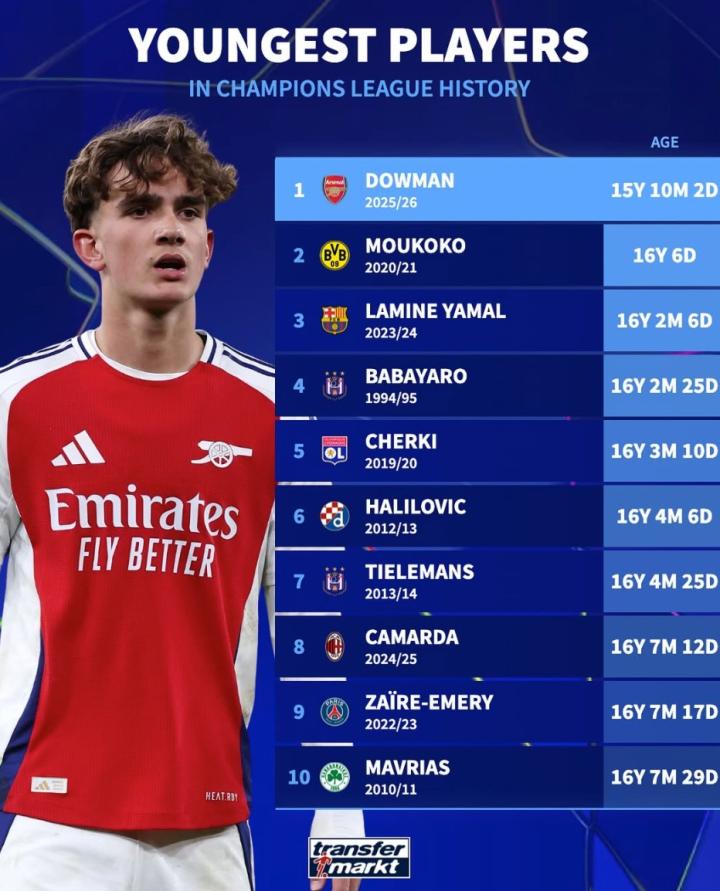 扫描下载懂球帝首页>动态> 欧冠最年轻出场前10:道曼、穆科科、亚马尔前3,谢尔基第5