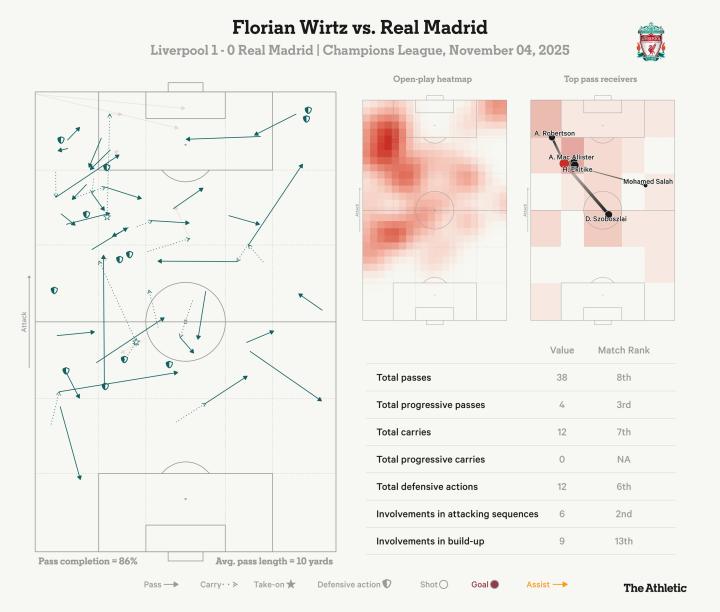 斯洛特完全有可能在客战曼城时采取不同的策略,但昨晚的左路角色应该成为维尔茨一个严肃的选择。正如这场对阵皇马的表现数据图所示,他并未被局限在左翼,而是显著参与了进攻组织,尤其是与索博斯洛伊的配合非常默契。