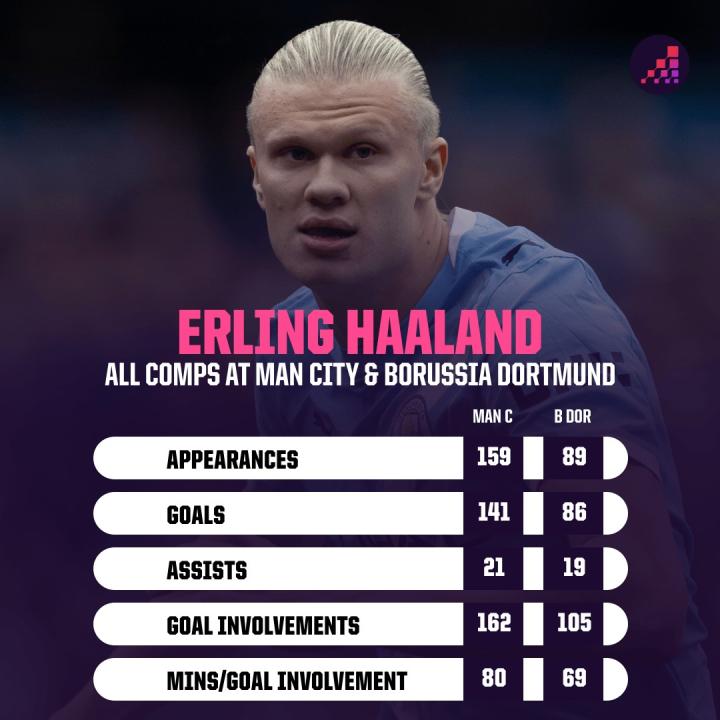 扫描下载懂球帝首页>动态> 高效!哈兰德曼城生涯80分钟参与一球,多特生涯69分钟造一球