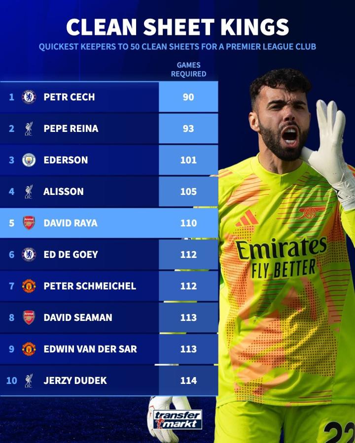 扫描下载懂球帝首页>动态> 英超俱乐部最快达成50场零封门将前10:切赫第1,拉亚第5