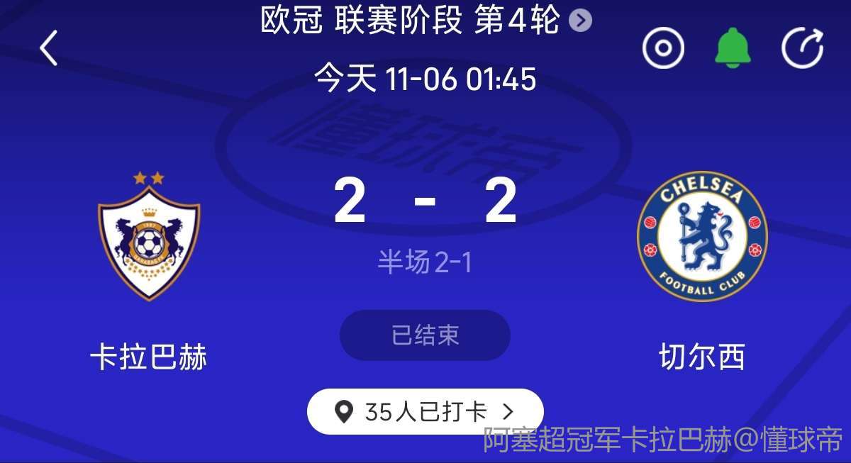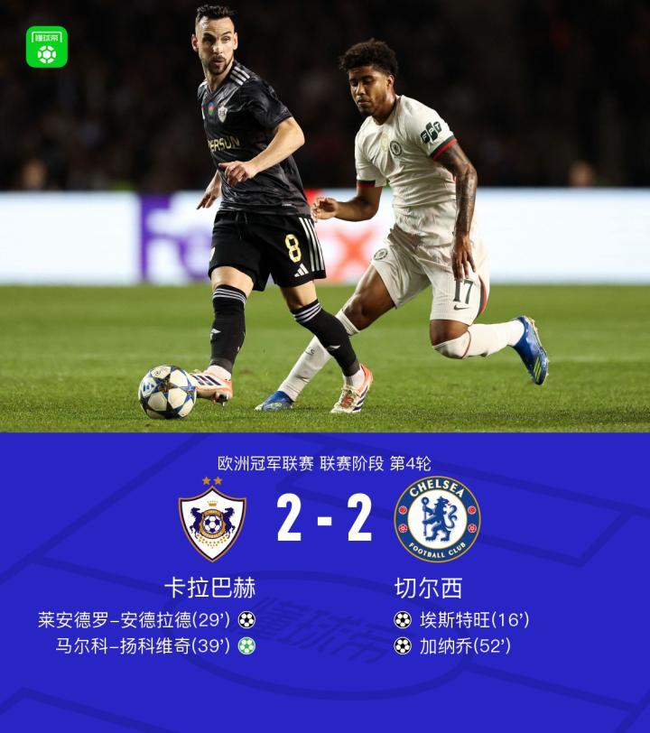 11-06 04:532-2战平切尔西,卡拉巴赫首次在欧战对阵英格兰球队拿分