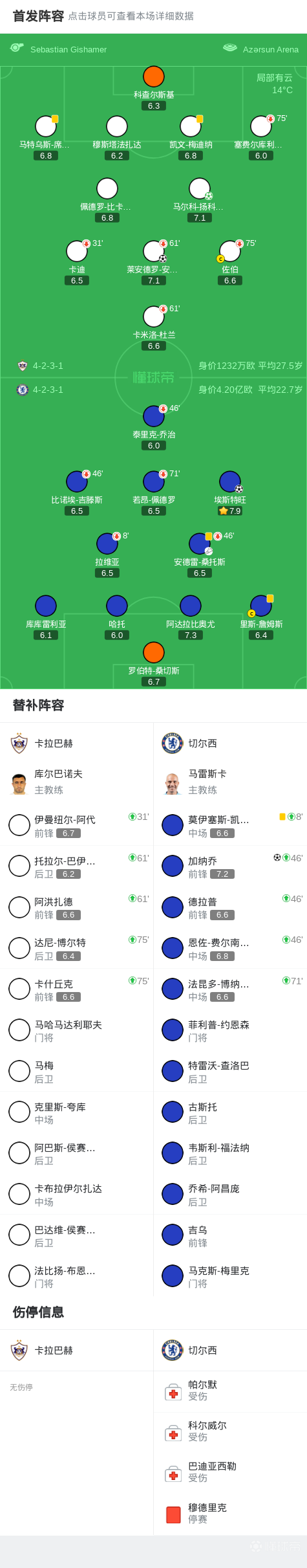 11-06 03:57首开记录,埃斯特旺当选卡拉巴赫vs切尔西全场最佳