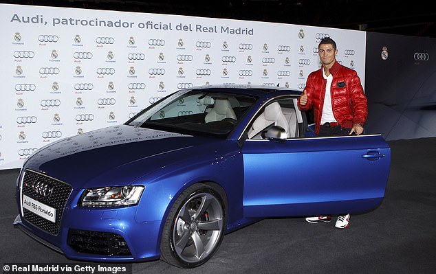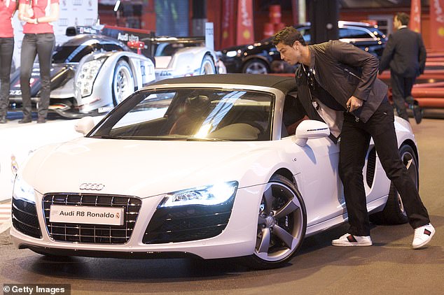 2011年,C罗在马德里的一次活动中与他的新款奥迪R8跑车合影。