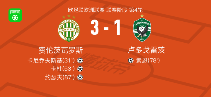 北京时间11月7日欧足联欧洲联赛 联赛阶段 第4轮,费伦茨瓦罗斯对阵卢多戈雷茨。费伦茨瓦罗斯卡尼乔夫斯基破门,卡杜破门,约瑟夫破门。卢多戈雷茨索恩破门。最终比分费伦茨瓦罗斯 3-1 卢多戈雷茨。