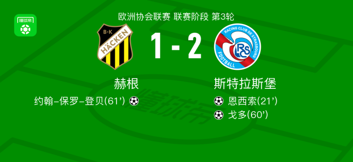 北京时间11月7日,欧洲协会联赛联赛阶段第3轮展开较量,赫根迎战斯特拉斯堡。比赛中,斯特拉斯堡率先打破僵局,恩西索接戈多的助攻成功破门。此后,阿莫-阿梅亚乌送出助攻,戈多建功,为球队扩大领先优势。随后,赫根由约翰-保罗-登贝攻入一球,迅速回应。最终,全场比分定格为赫根1-2斯特拉斯堡。