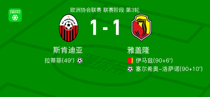 北京时间11月7日欧洲协会联赛 联赛阶段 第3轮,斯肯迪亚对阵雅盖隆。斯肯迪亚拉蒂菲破门。雅盖隆塞尔希奥-洛萨诺破门。最终比分斯肯迪亚 1-1 雅盖隆。