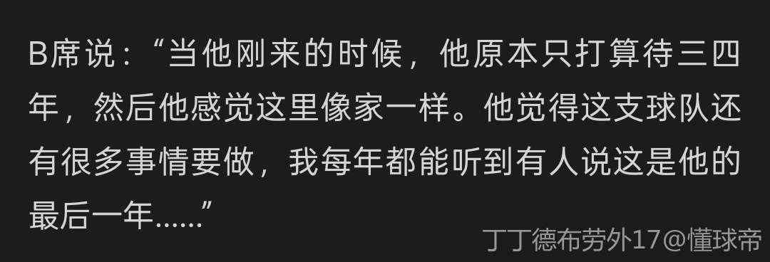 B席说:“当他刚来的时候,他原本只打算待三四年,然后他感觉这里像家一样。他觉得这支球队还有很多事情要做,我每年都能听到有人说这是他的最后一年……”