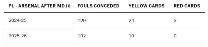 在那赛季的下半段,情况有所改善,但阿森纳在本赛季至今的纪律记录表明,阿尔特塔的讯息终于传达到了球员心中。