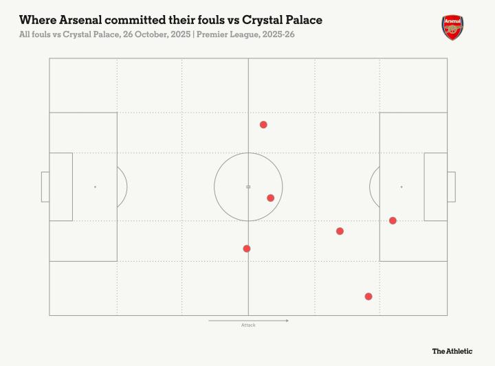 下图中的圆点标示了阿森纳在该场比赛中犯下6次犯规的位置。所有这些犯规都发生在水晶宫的半场。