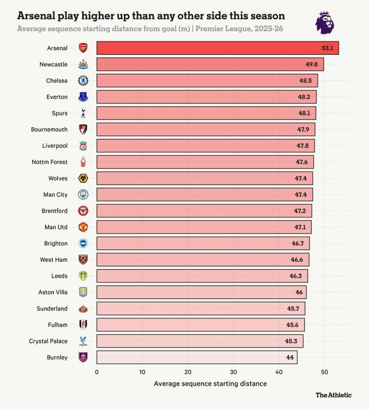 阿森纳的纪律记录也有其结构性因素,例如他们阵型前压的程度。他们的平均进攻序列起点——Opta 将“进攻序列”定义为 “某一队连续控球的进攻过程,以防守动作、比赛中断或射门结束”——达到53.1米,是英超所有球队中最高的。