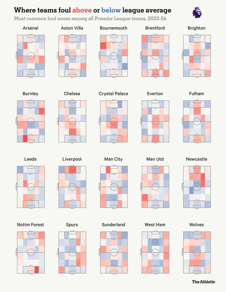 The Athletic 已将本赛季20家俱乐部的犯规地点绘制成图,并与英超其他球队进行了比较。