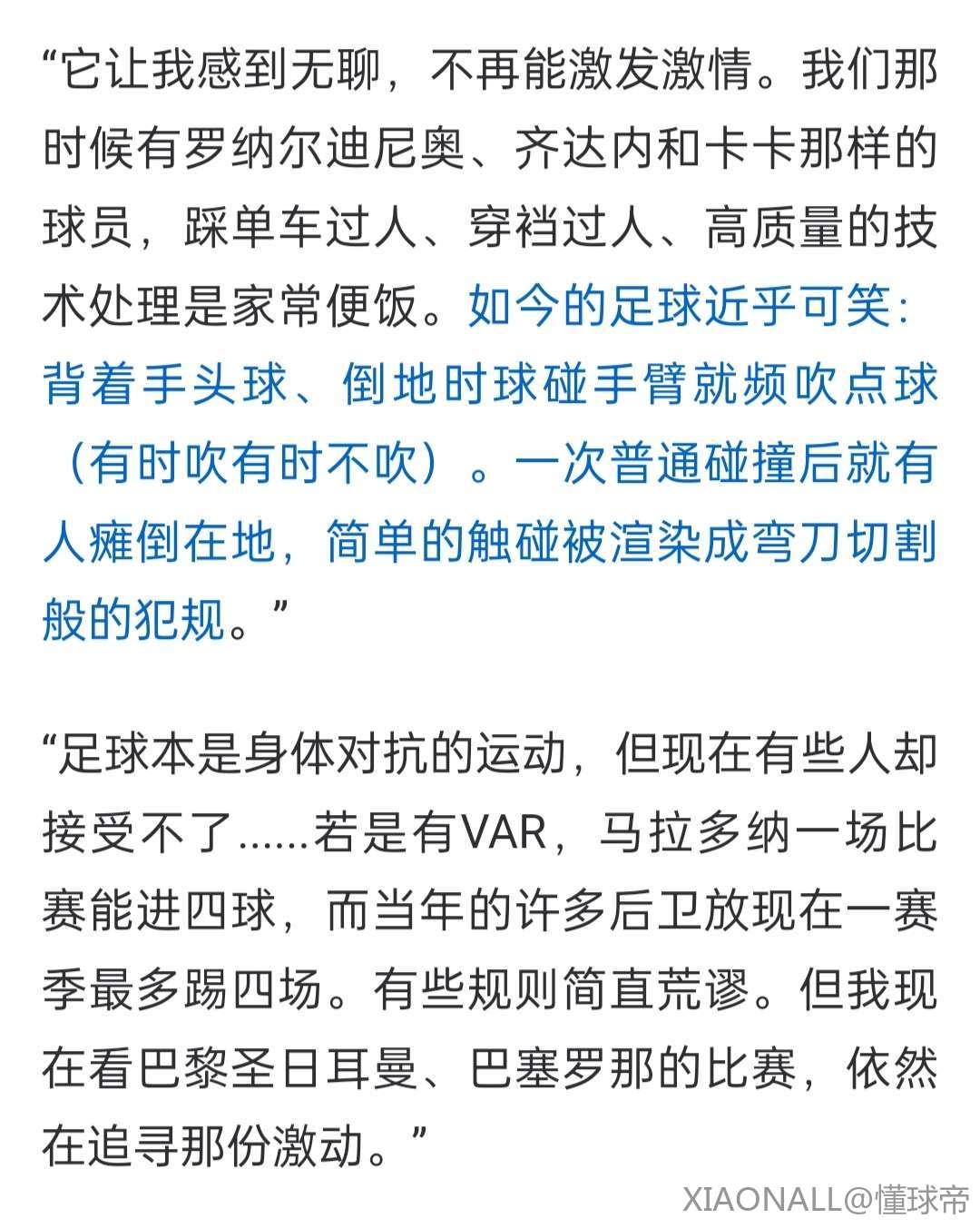 “足球本是身体对抗的运动,但现在有些人却接受不了......若是有VAR,马拉多纳一场比赛能进四球,而当年的许多后卫放现在一赛季最多踢四场。有些规则简直荒谬。但我现在看巴黎圣日耳曼、巴塞罗那的比赛,依然在追寻那份激动。”