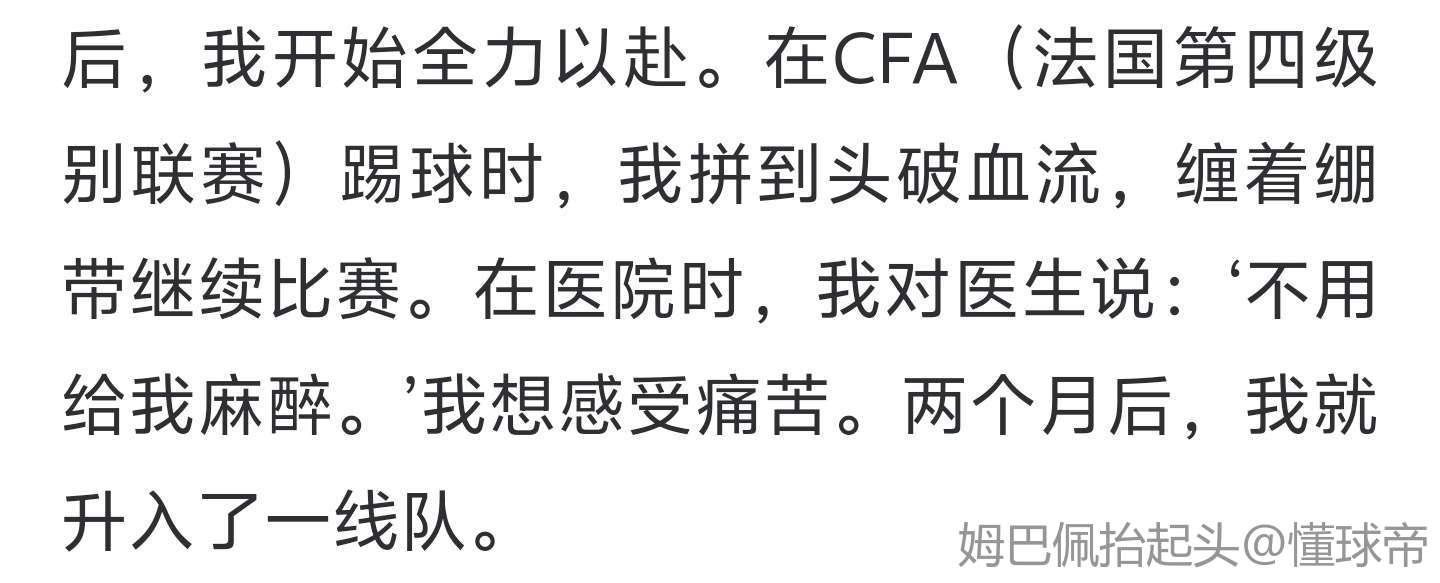 在场外,我像个战士一样,做引体向上,洗冷水澡。但在场上,我却很温和。从那以后,我开始全力以赴。在CFA(法国第四级别联赛)踢球时,我拼到头破血流,缠着绷带继续比赛。在医院时,我对医生说:‘不用给我麻醉。’我想感受痛苦。两个月后,我就升入了一线队。