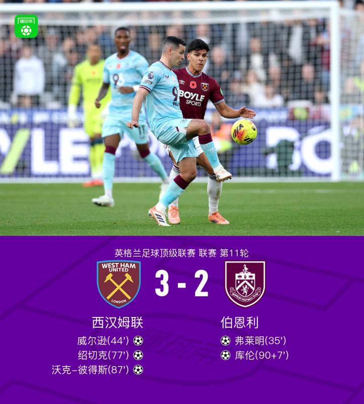 11-08 23:10全场比赛结束 | 西汉姆联 3-2 伯恩利威尔逊...