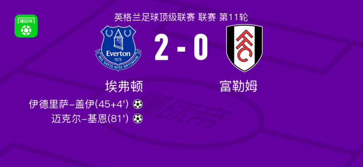11-09 02:04埃弗顿2-0富勒姆,盖伊、基恩破门,埃弗顿进球三次被吹