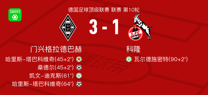 扫描下载懂球帝首页>动态> 门兴格拉德巴赫3-1科隆,凯文-迪克斯点射破门,哈里斯-塔巴科维奇1射1传