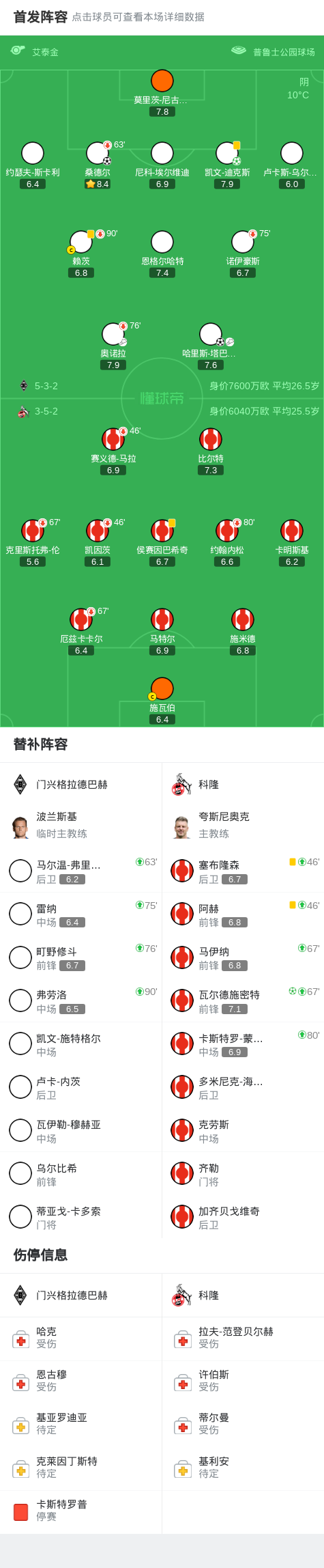 11-09 06:36半场战报:门兴格拉德巴赫1-0科隆