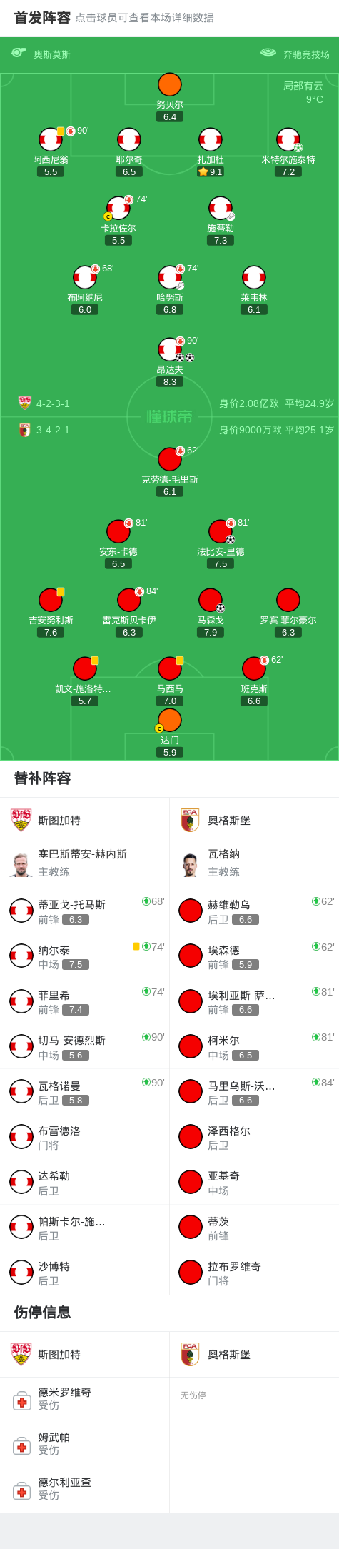 北京时间11月10日德国足球顶级联赛 联赛 第10轮,斯图加特主场对阵奥格斯堡。斯图加特米特尔施泰特破门,昂达夫梅开二度。奥格斯堡法比安-里德破门,马森戈破门。最终比分斯图加特 3-2 奥格斯堡。