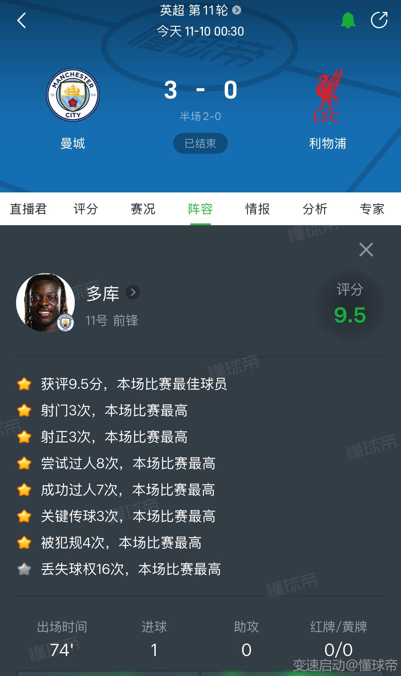11-10 00:14封神一战,多库当选曼城vs利物浦全场最佳球员