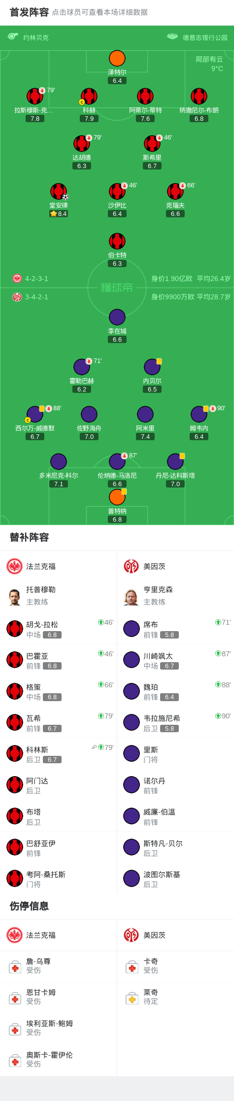 第80分钟,堂安律右路突破两人防守,小角度推射破门,法兰克福1-0