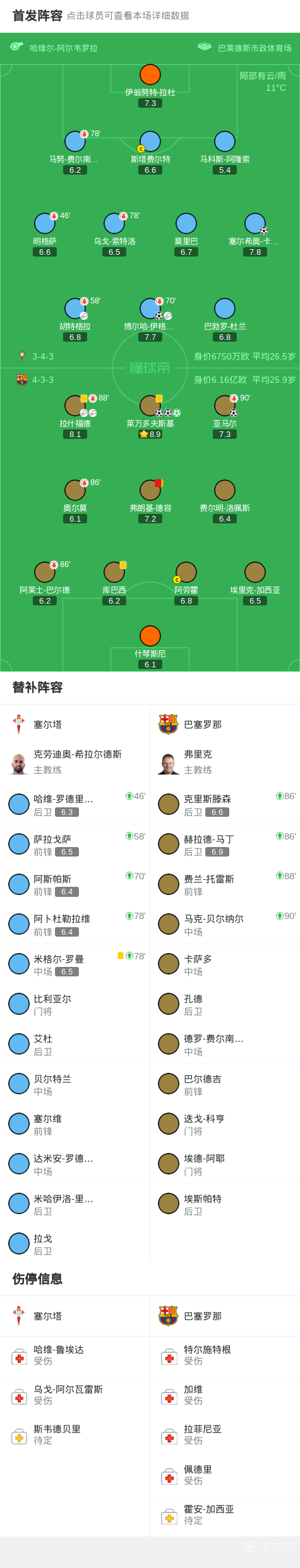 第11分钟,迅速扳平!卡雷拉快速突破推射破门,塞尔塔1-1巴萨