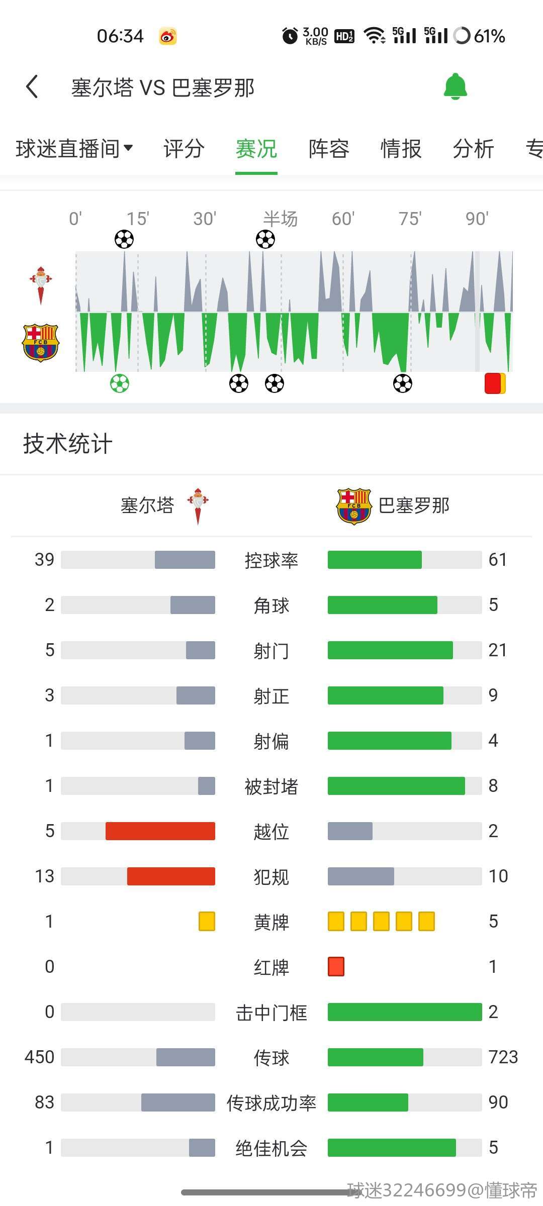 √裁判真不当人,同样的尺度巴萨这边给牌,对面是真不给牌,对面今天战术犯规有吃过牌吗?唯一一张黄牌还是因为看到藤森被肘出血了才给的,牌给的莫名其妙,德荣今天都被踢成球了,最后还给德荣给罚下去了,下场咋踢?