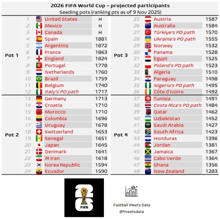 11月9日,意大利媒体《足球与金融》援引某知名足球数据网站Football Meets Data消息,国际足联正认真考虑调整世界杯抽签分档规则,计划根据各队的FIFA世界排名来决定分档,而不再单独把附加赛出线的球队全部放入第四档。世界杯小组抽签将于12月5日在华盛顿举行。