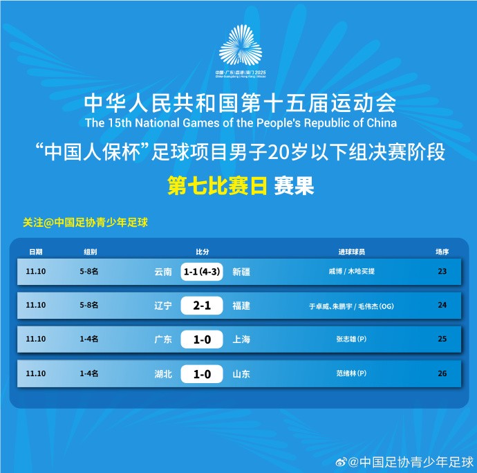 北京时间11月10日,2025全运会U20男足半决赛进行。最终,广东U20与湖北U20会师决赛。
