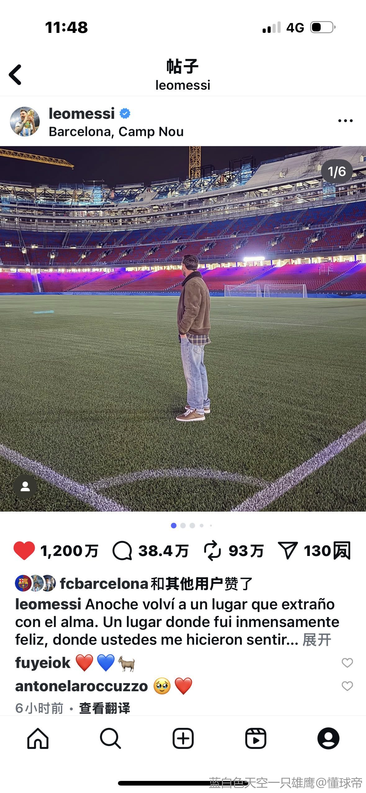 扫描下载懂球帝首页>动态> 发布仅4个小时后,梅西造访诺坎普社媒动态点赞已突破1000万