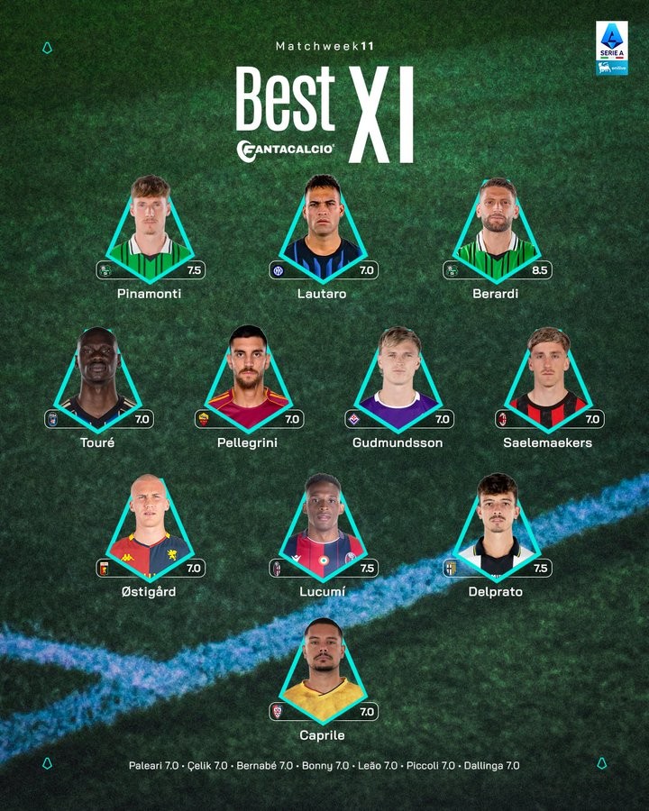 扫描下载懂球帝首页>动态> 意甲第11轮最佳阵容:劳塔罗领衔,佩7、萨56、贝拉尔迪入选