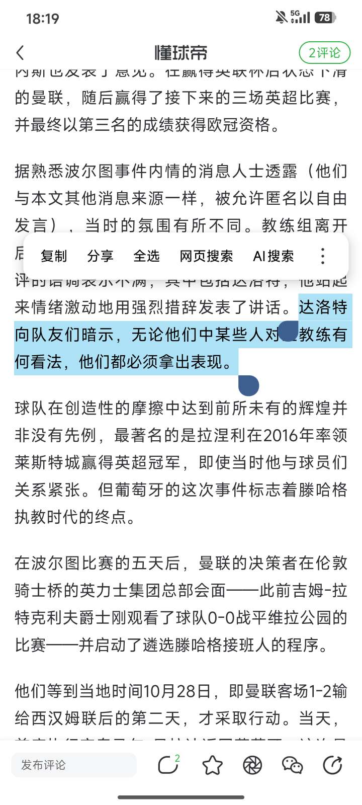 据熟悉波尔图事件内情的消息人士透露(他们与本文其他消息来源一样,被允许匿名以自由发言),当时的氛围有所不同。教练组离开后,球员们讨论了情况。不止一人对滕哈格批评的语调表示不满,其中包括达洛特,他站起来情绪激动地用强烈措辞发表了讲话。达洛特向队友们暗示,无论他们中某些人对主教练有何看法,他们都必须拿出表现。