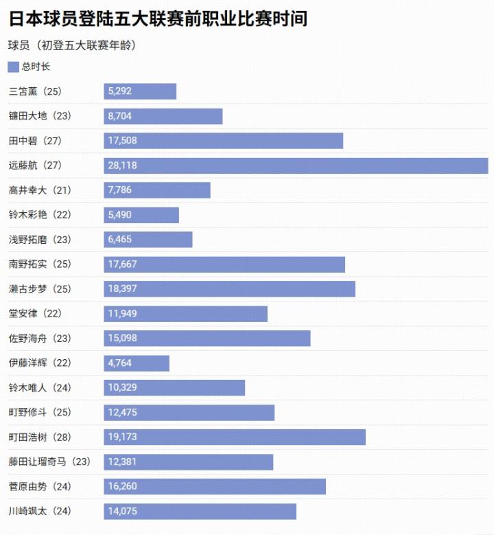 我们进一步总览现役20名五大联赛效力的日本球员,我们获得了以下的数据:登陆五大联赛用时最少的是目前效力于拜仁的伊藤洋辉,总计在J联赛踢了4764分钟;耗时最多的是远藤航,加盟斯图加特前,他在 J 联赛累计出战 24107 分钟,比甲出场 2120 分钟,德乙征战 1891 分钟,在近 30000 分钟的高强度比赛历练后,时年 27 岁 8 个月的他才首次踏上五大联赛赛场。