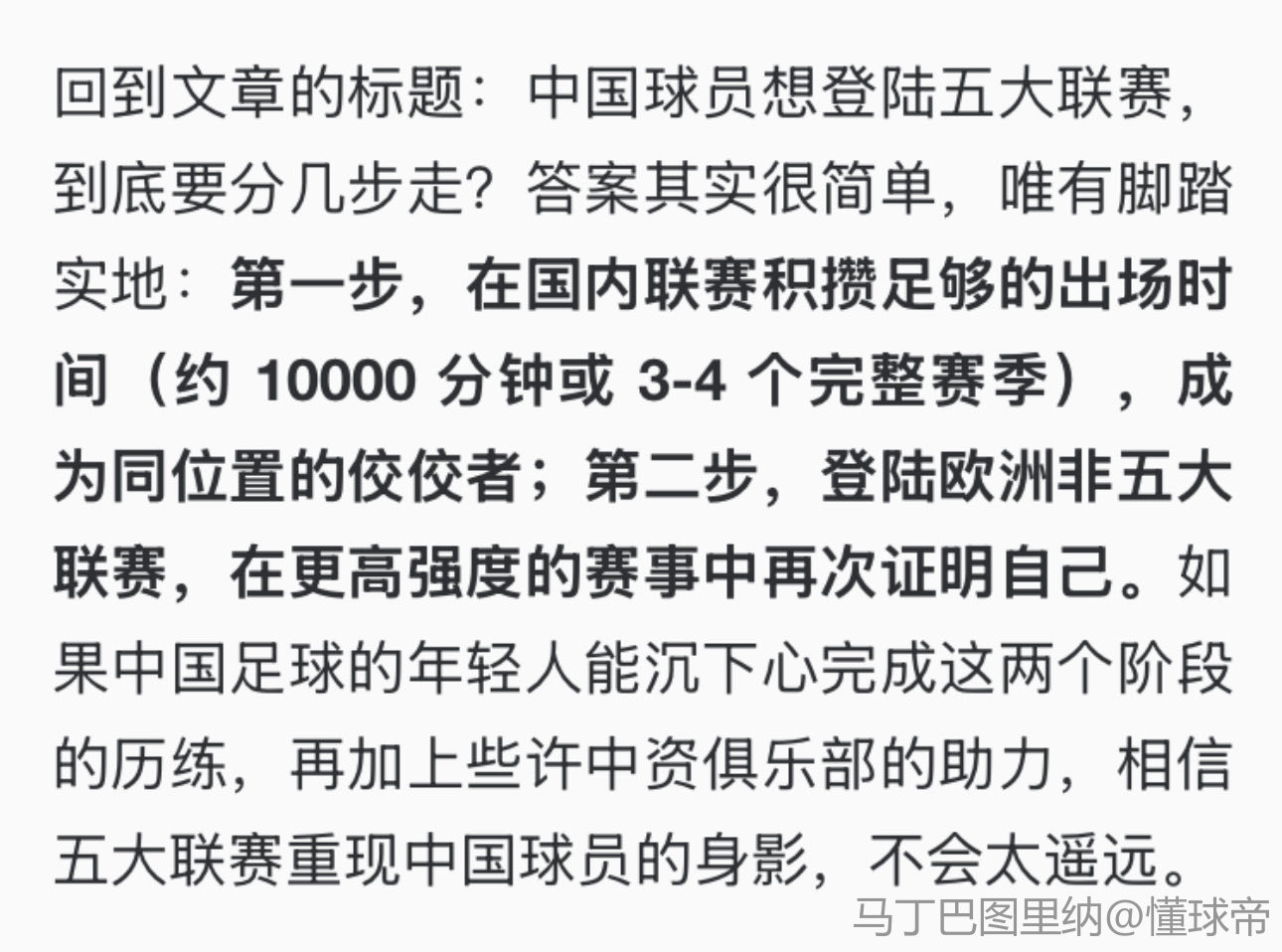 高质量比赛(职业联赛)时间的积累对于球员发展是最关键的,不要再讲那些国内顶级职业联赛时间才几百分钟甚至挂0就要登陆五大联赛的混话了。